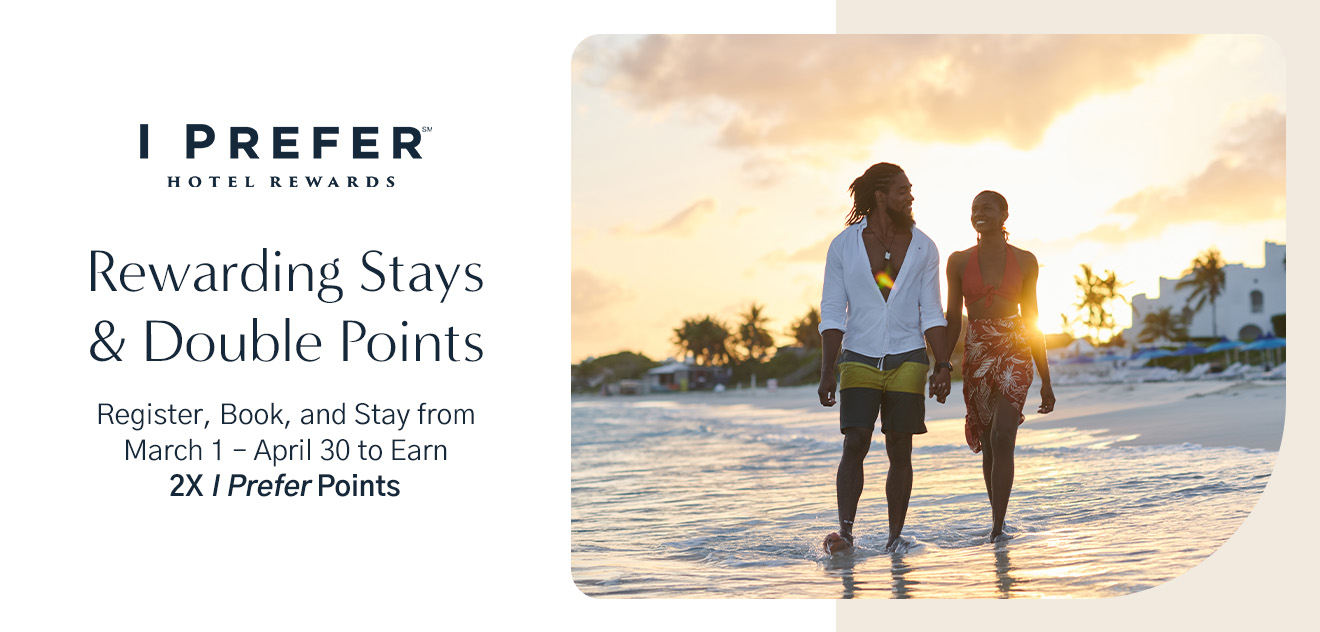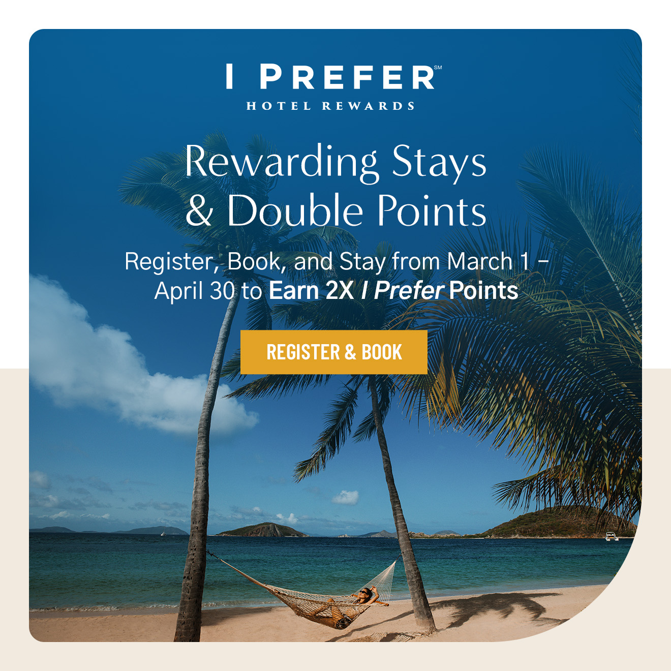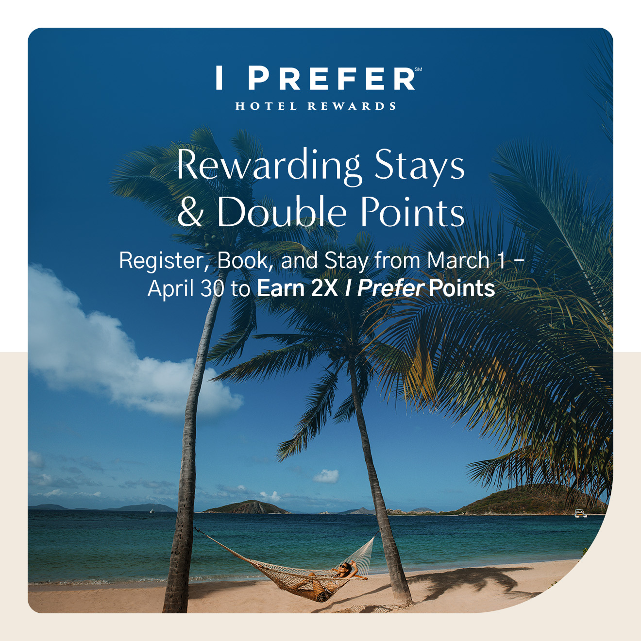 "Members who register and book January 22 through April 30, 2026, and stay March 1 through April 30, 2026, will receive double base points (a member will earn ten (10) base Points for each U.S. dollar or the currency equivalent, that is incurred and paid for by the member on Reservation Revenue except at andBeyond properties or The Brando, where a Member will earn five (5) base Points for each U.S. dollar spent on Reservations Revenue). Must stay a minimum of two (2) nights to qualify. Double points are calculated on base points only and will not be added to the regular bonus points earned as a Gold (20%) or Titanium (50%) member. This offer may be applied to qualified stays as outlined in the I Prefer Hotel Rewards program Terms and Conditions. Bonus points earned will not count towards tier upgrade qualification. For questions related to registration or Rewarding Stays & Double Points, please use the "Contact Us" form found here."