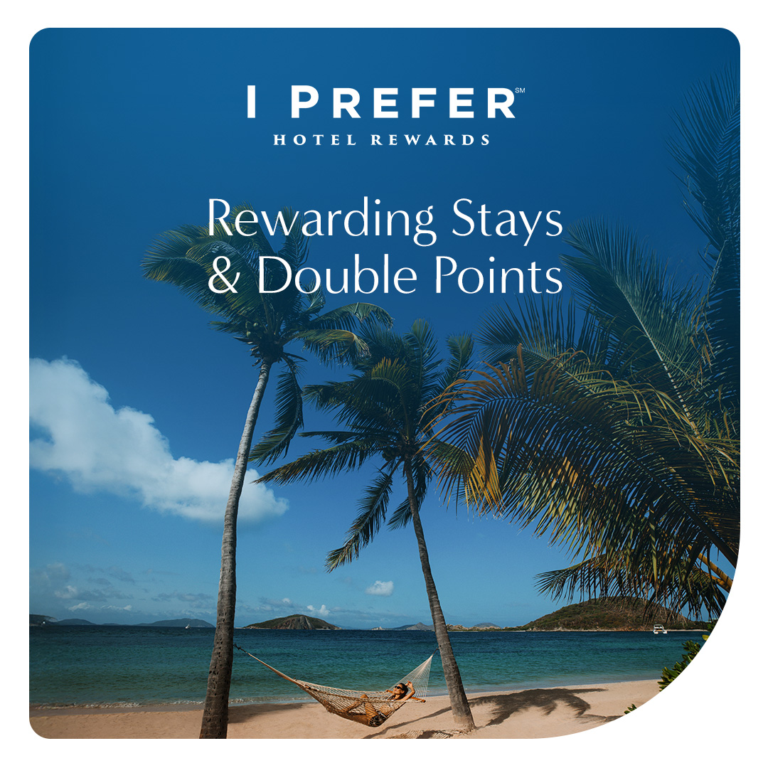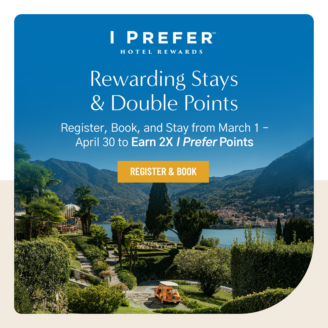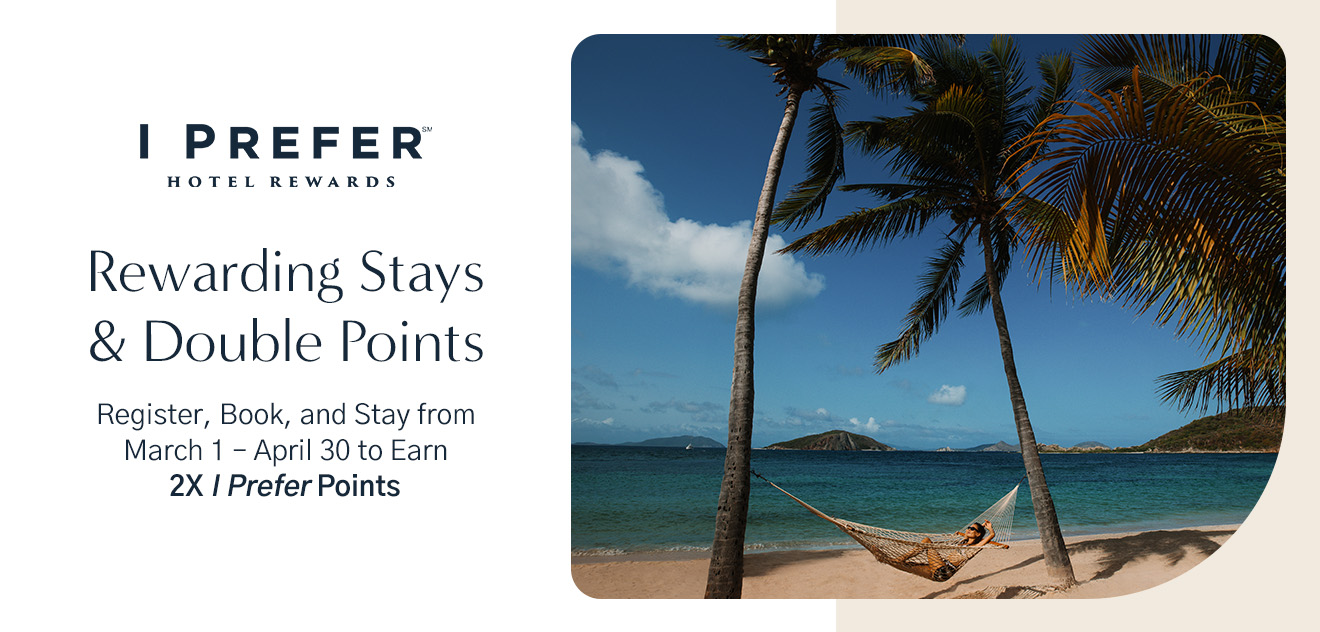 For a limited time, I Prefer Hotel Rewards Members can earn double points with every stay at [HOTEL NAME]. Register and book between January 22 and April 30, 2026, and earn twice the points on stays between March 1 and April 30, 2026. Whether you’re planning a weekend escape or a well-deserved retreat, it’s the perfect time to discover the benefits of I Prefer membership.
