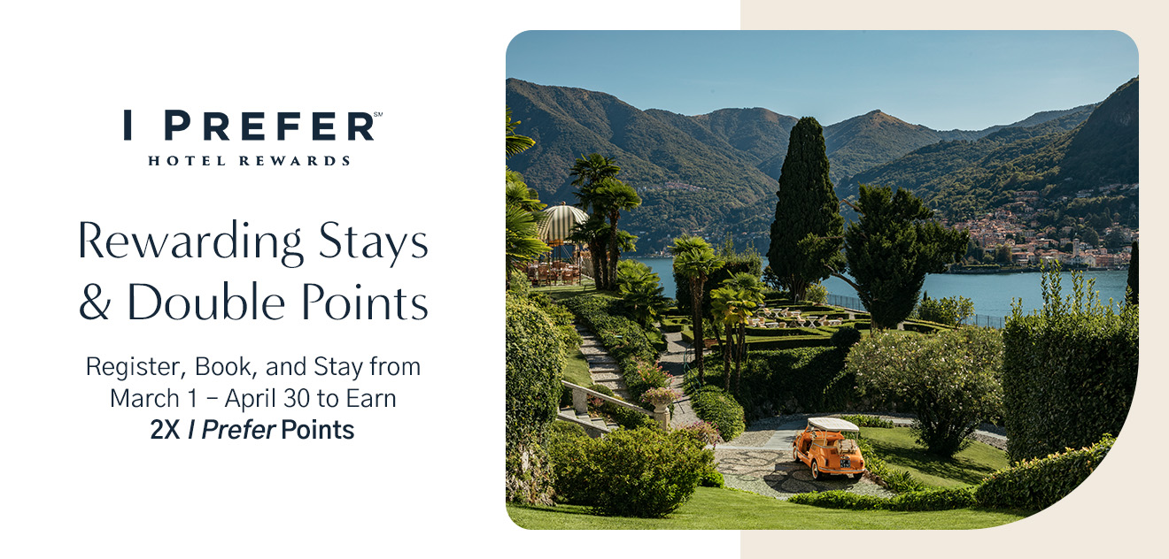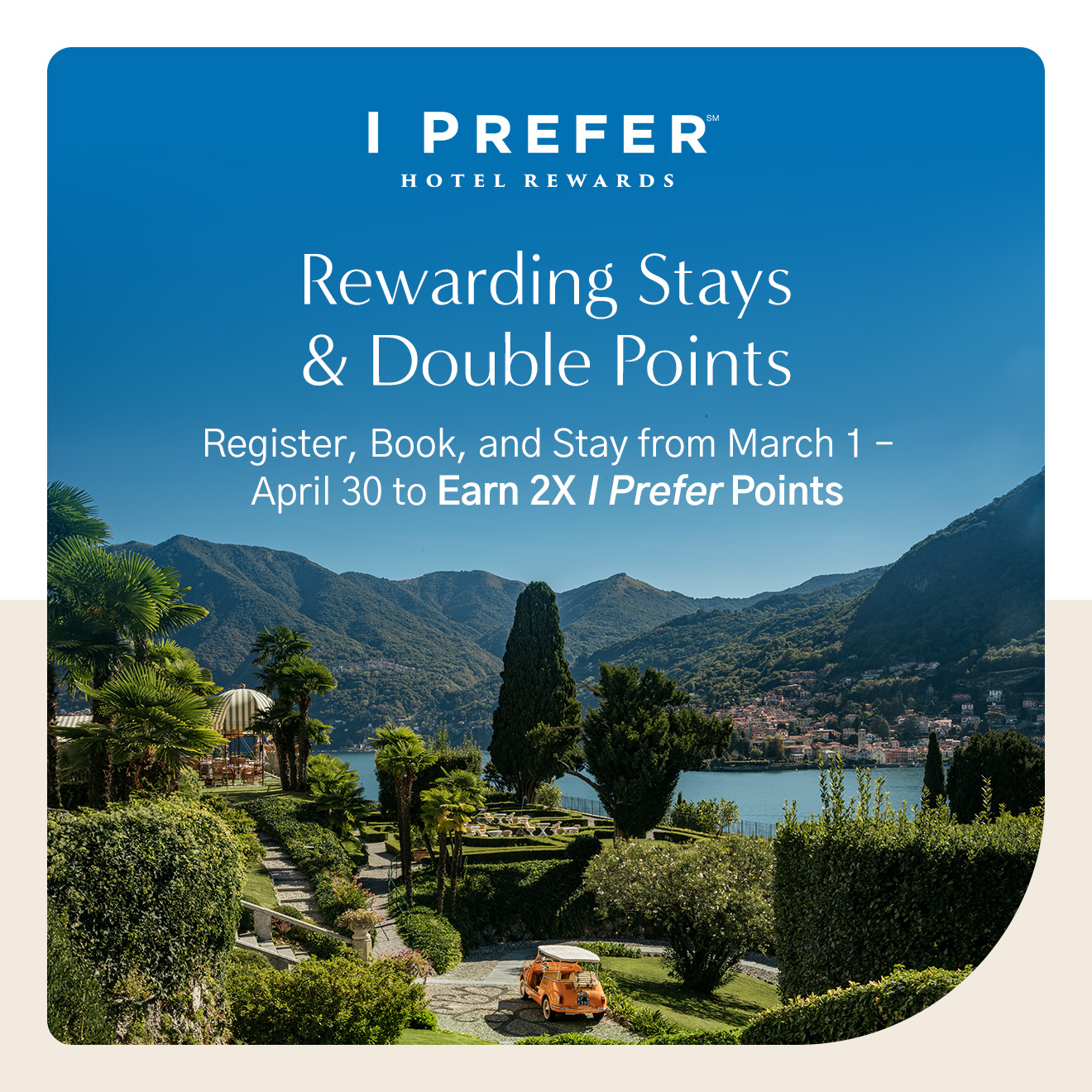 For a limited time, I Prefer Hotel Rewards Members can earn double points with every stay at [HOTEL NAME]. Register and book between January 22 and April 30, 2026, and earn twice the points on stays between March 1 and April 30, 2026. Whether you’re planning a weekend escape or a well-deserved retreat, it’s the perfect time to discover the benefits of I Prefer membership.