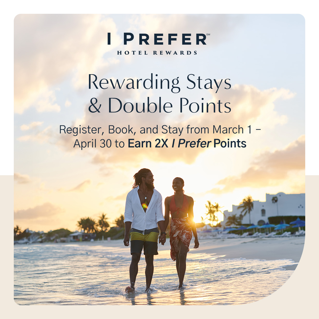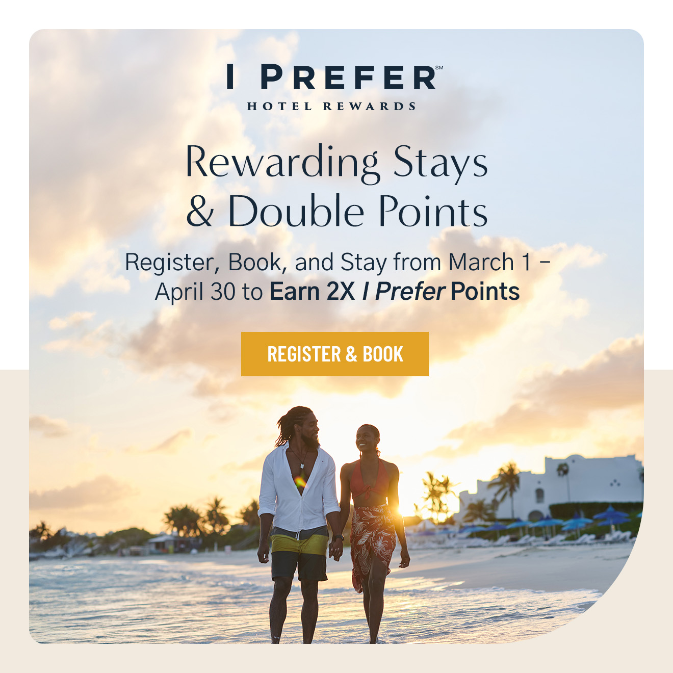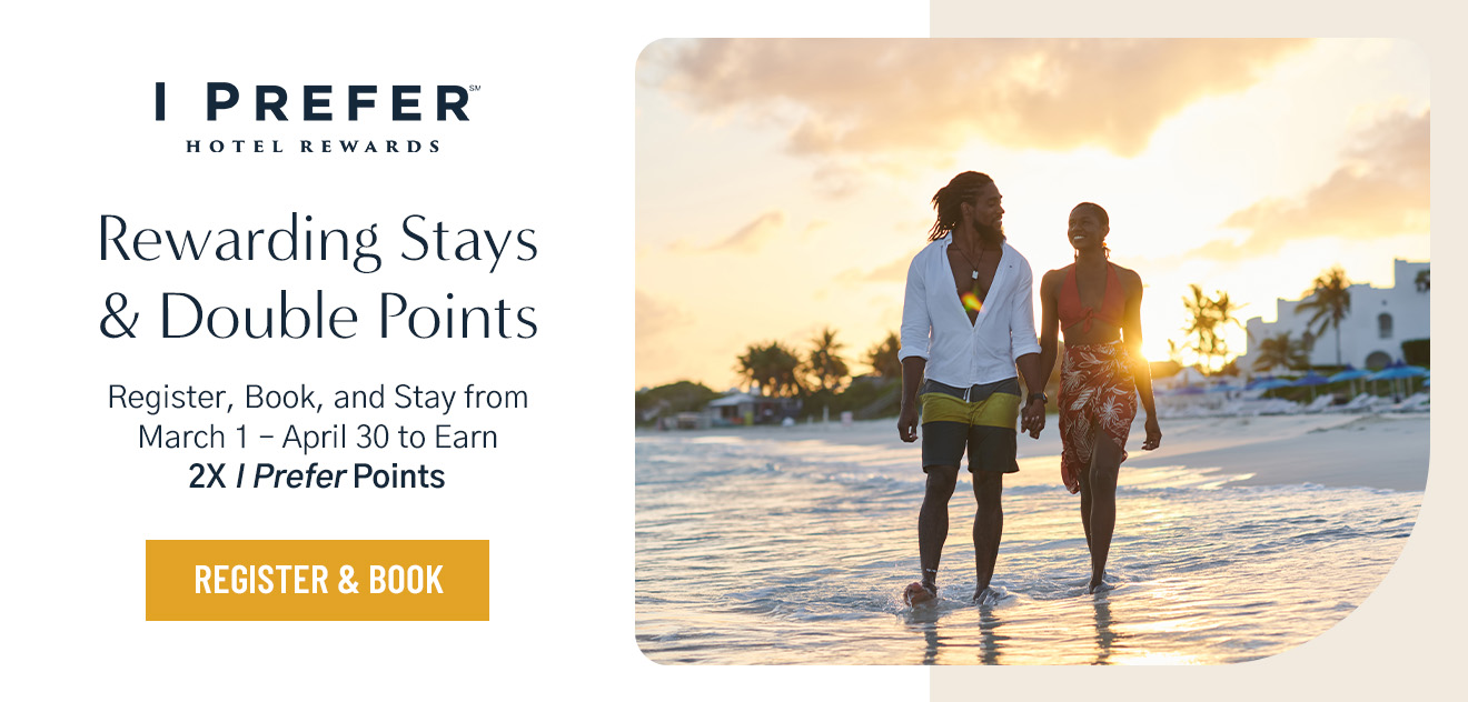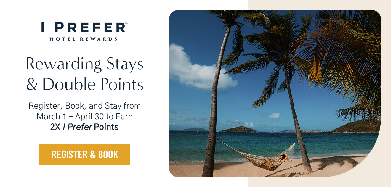 "Members who register and book January 22 through April 30, 2026, and stay March 1 through April 30, 2026, will receive double base points (a member will earn ten (10) base Points for each U.S. dollar or the currency equivalent, that is incurred and paid for by the member on Reservation Revenue except at andBeyond properties or The Brando, where a Member will earn five (5) base Points for each U.S. dollar spent on Reservations Revenue). Must stay a minimum of two (2) nights to qualify. Double points are calculated on base points only and will not be added to the regular bonus points earned as a Gold (20%) or Titanium (50%) member. This offer may be applied to qualified stays as outlined in the I Prefer Hotel Rewards program Terms and Conditions. Bonus points earned will not count towards tier upgrade qualification. For questions related to registration or Rewarding Stays & Double Points, please use the "Contact Us" form found here."