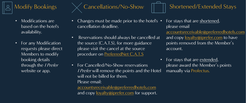 Changes must be made prior to the hotel's cancellation deadline. Modifications are based on the hotel's availability. Please visit the I Prefer Hotel Rewards website at https://iprefer.com and click on the “Modify a Reservation” link or contact +1 (877) 497-6976 (US Toll Free) or Worldwide Toll +1 (314) 900-1482.