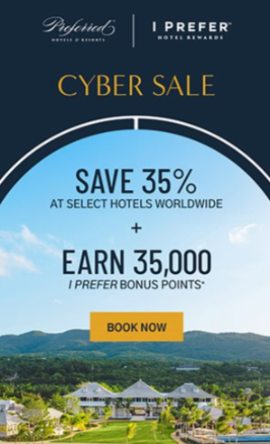 Save 35% on stays of two nights or more at [HOTEL NAME]. Plus I Prefer Hotel Rewards members earn an extra 35,000 bonus points when you register here [LINK: https://iprefer.com/special-offers/cyber-sale] for this limited time offer.